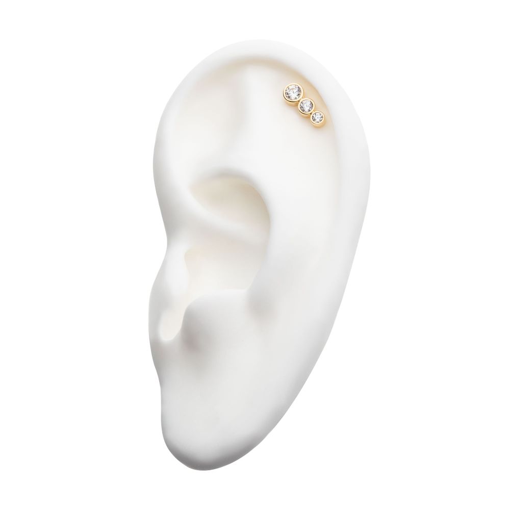 14Kt Yellow Gold Threadless with Bezel Set 3 Clear CZ Cluster Top is made of solid 14kt nickel-free Gold with durable 316LVM ASTM F-138 Implant Grade Steel Pin designed to be practical and easy to use. Fits all sizes of pins and bases in our threadless body jewelry line. Pin Size: 0.45mm x 4.7mm.