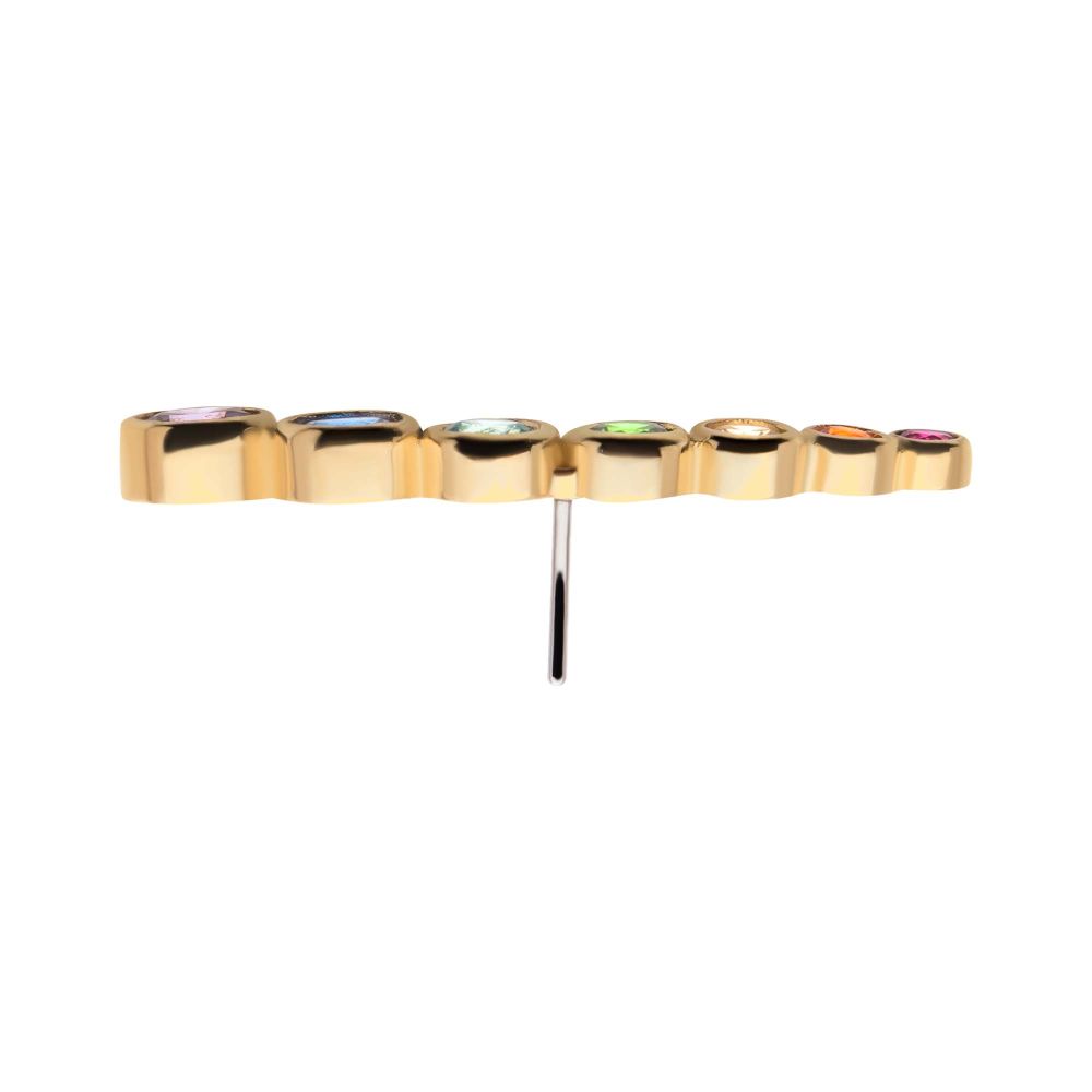 14Kt Yellow Gold Threadless with Bezel Set Rainbow CZ 7-Cluster Top (Left Ear) is made of solid 14kt nickel-free Gold with durable 316LVM ASTM F-138 Implant Grade Steel Pin designed to be practical and easy to use. Fits all sizes of pins and bases in our threadless body jewelry line. The Pride Collection. Pin Size: 0.45mm x 4.7mm.