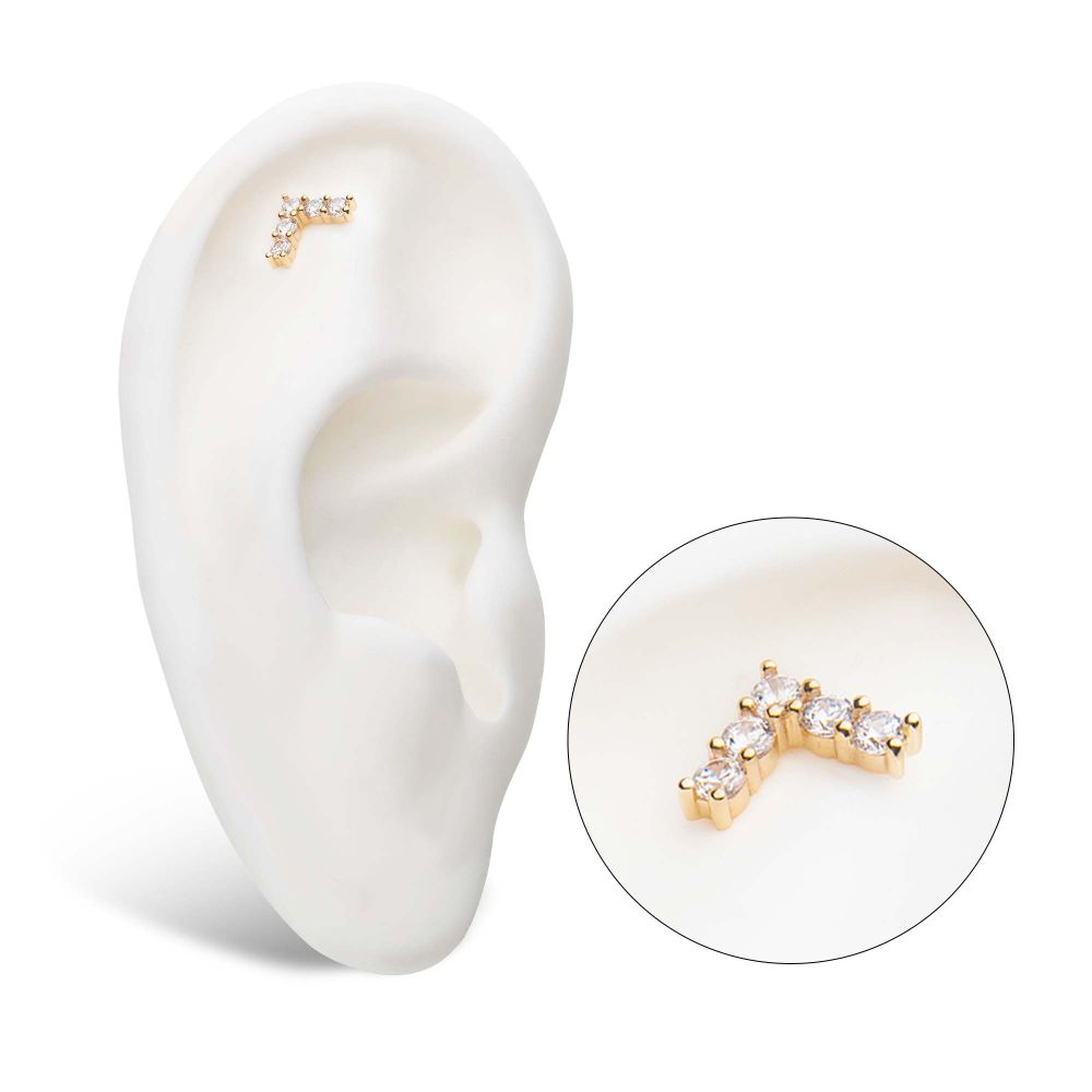 14Kt Yellow Gold Threadless with Prong Set 5 Round Clear CZ Triangle Top is made of solid 14kt nickel-free Gold with durable 316LVM ASTM F-138 Implant Grade Steel Pin designed to be practical and easy to use. Fits all sizes of pins and bases in our threadless body jewelry line. Pin Size: 0.45mm x 4.7mm.