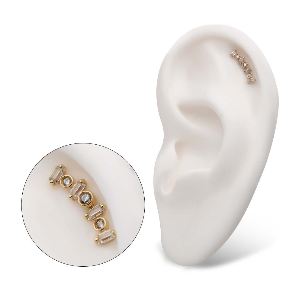 14Kt Yellow Gold Threadless with Prong Set Baguette Clear CZ Cluster Top is made of solid 14kt nickel-free Gold with durable 316LVM ASTM F-138 Implant Grade Steel Pin designed to be practical and easy to use. Fits all sizes of pins and bases in our threadless body jewelry line. Pin Size: 0.45mm x 4.7mm.