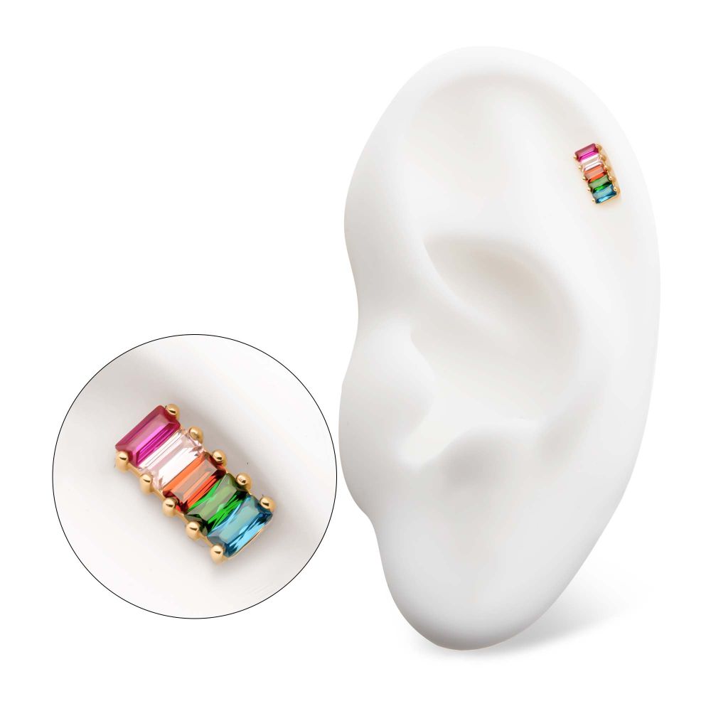 14Kt Yellow Gold Threadless with Prong Set Baguette Rainbow CZ 5-Cluster Top is made of solid 14kt nickel-free Gold with durable 316LVM ASTM F-138 Implant Grade Steel Pin designed to be practical and easy to use. Fits all sizes of pins and bases in our threadless body jewelry line. Pin Size: 0.45mm x 4.7mm.