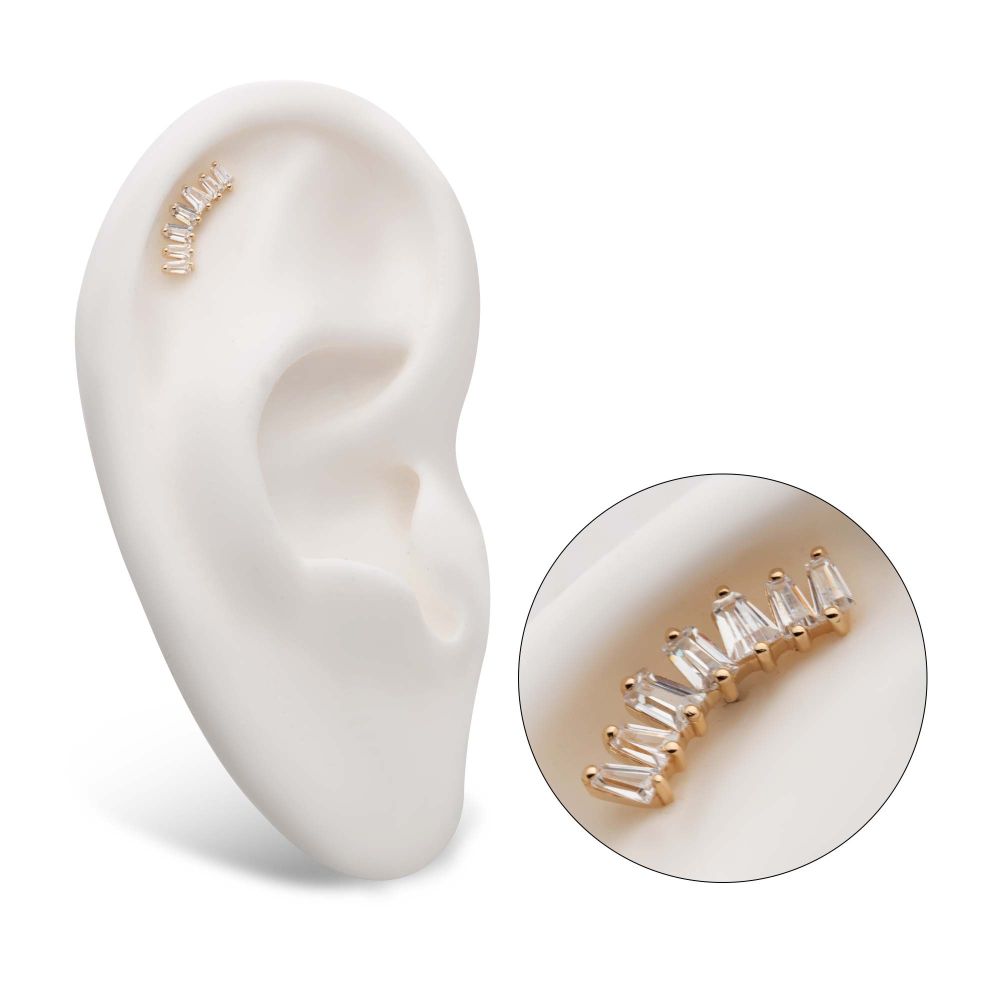 14Kt Yellow Gold Threadless with Prong Set Tapered Baguette Clear CZ Cluster Top is made of solid 14kt nickel-free Gold with durable 316LVM ASTM F-138 Implant Grade Steel Pin designed to be practical and easy to use. Fits all sizes of pins and bases in our threadless body jewelry line. Pin Size: 0.45mm x 4.7mm.