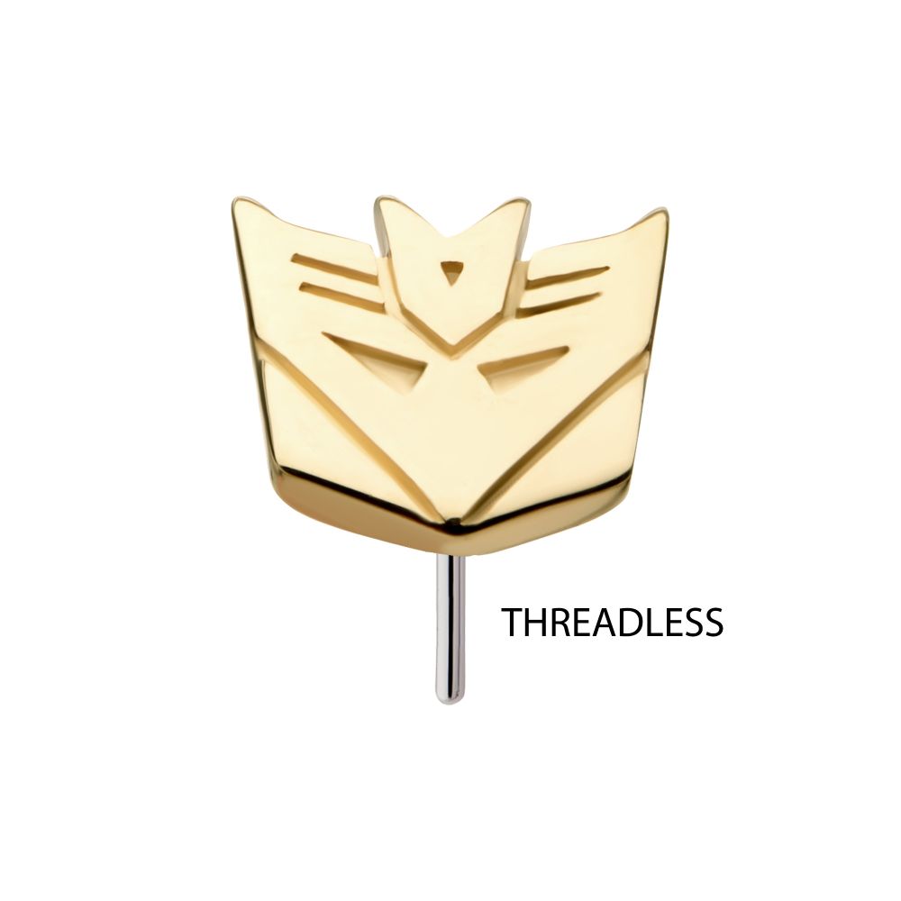 14Kt Yellow Gold Transformers Decepticon Logo Threadless Top is made of solid 14kt nickel-free Gold with durable 316LVM ASTM F-138 Implant Grade Steel Pin designed to be practical and easy to use. Fits all sizes of pins and bases in our threadless body jewelry line. Pin Gauge: 25g