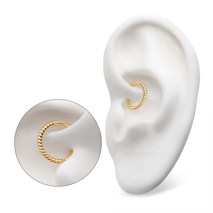 14Kt Yellow Gold with Half-Twisted Circle Seamless Split Ring is manufactured out of solid 14kt nickel-free. Seamless rings offer a sleek style to almost any body piercing. Free from the seams of a segment or clicker H₂O₂ or the captive bead of a captive bead ring, seamless H₂O₂s create an understated aesthetic for those who prefer subtle styles. These rings appear to be continuous but are opened and closed by twisting the ends sideways, carefully. Most commonly worn in the nose and ear.