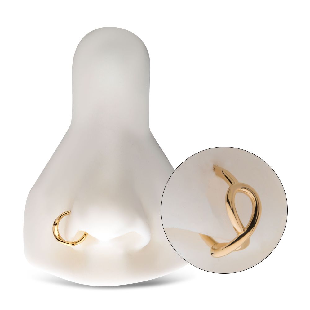 14Kt Yellow Gold with Infinity Symbol Side Facing Hinged Segment Clicker. The Hinged Segment Clicker offers an easy-to-use design with a minimal seam for an aesthetic that's similar to a segment ring without the stress of dealing with a segment that can get lost. The Hinged Segment Clicker is characterized by the hinged prong that snaps into place with a satisfying click. Perfect for Helix, Septum, and Cartilage. Made of solid 14kt nickel-free Gold.
