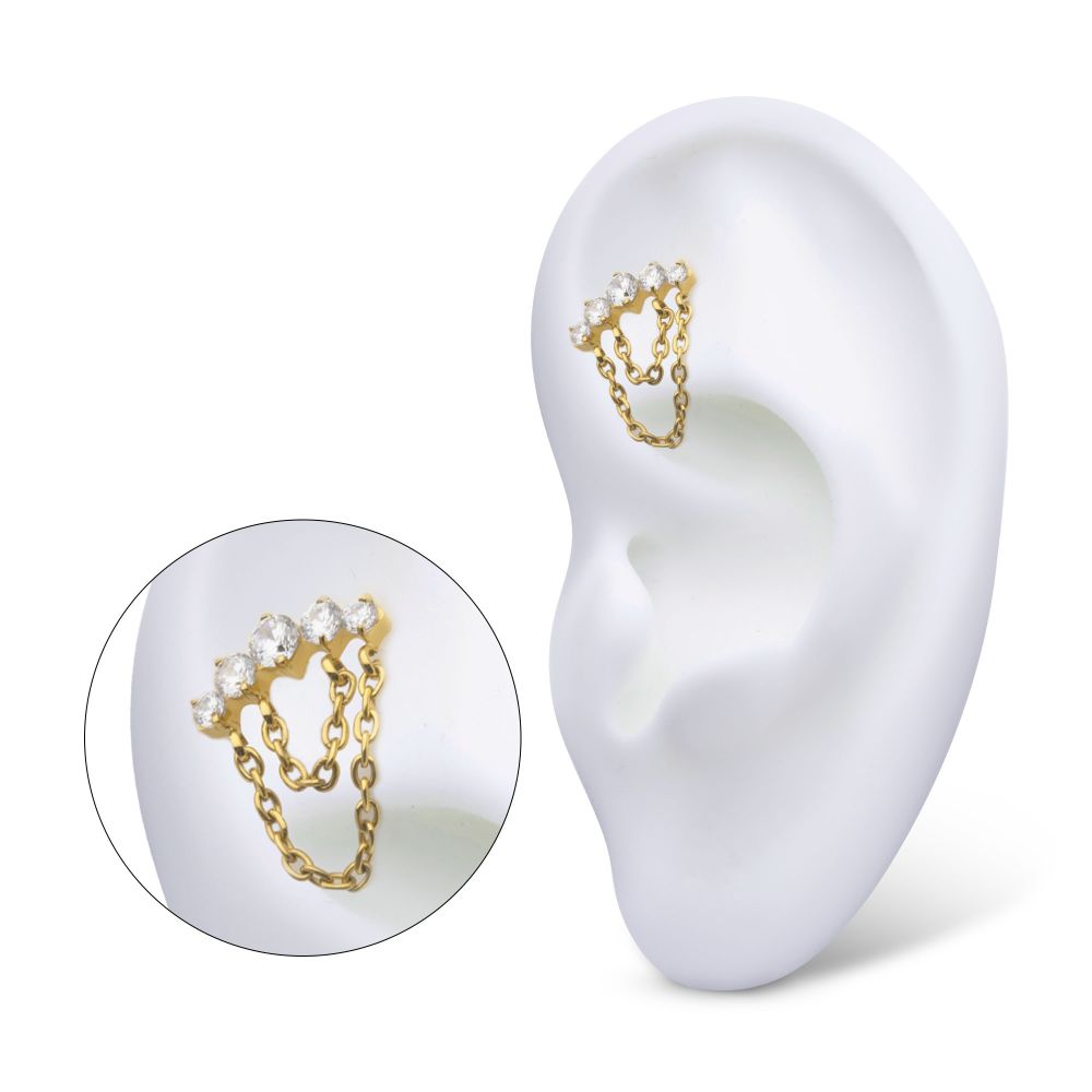 24Kt Gold PVD Titanium Internally Threaded 5-Cluster Round AAA CZ Top with 2 Tier Dangle Chain. Manufactured from High Polish Implant Grade Titanium (Ti-6AL-4V-ELI ASTM F136). To secure the inside bar or base, add a slight bend to the pin by simply inserting the pin halfway and pushing the top to one side.