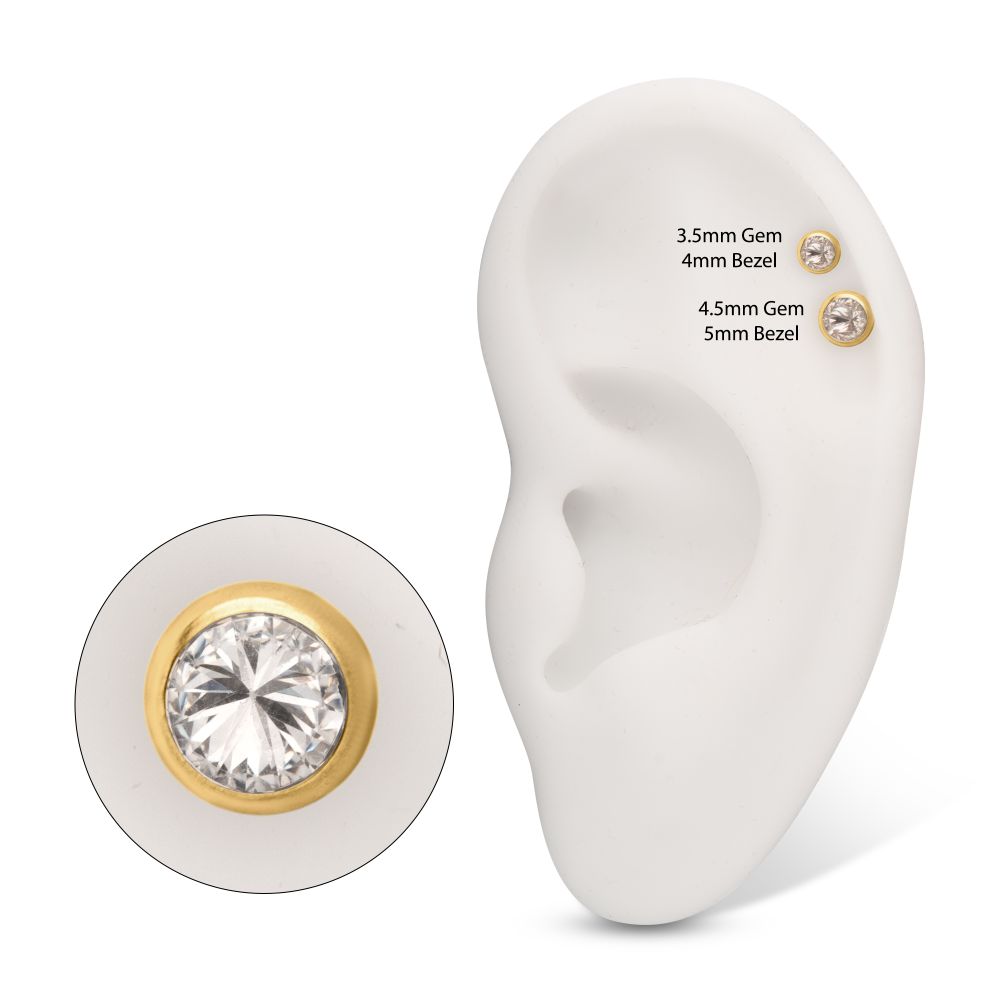 24Kt Gold PVD Titanium Internally Threaded Low Profile Bezel Set Gem Top. Manufactured from High Polish Implant Grade Titanium (Ti-6AL-4V-ELI ASTM F136).