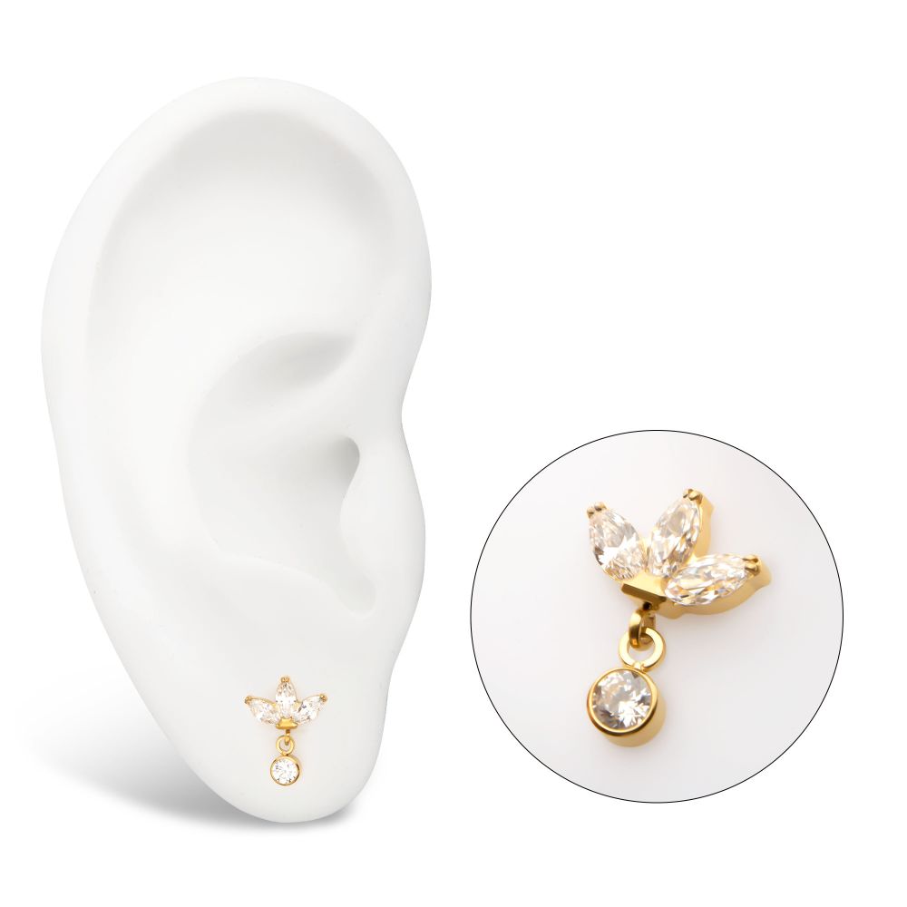 24KT Gold PVD Titanium Threadless 3 Marquise Fan Top with Bezel Gem Dangle