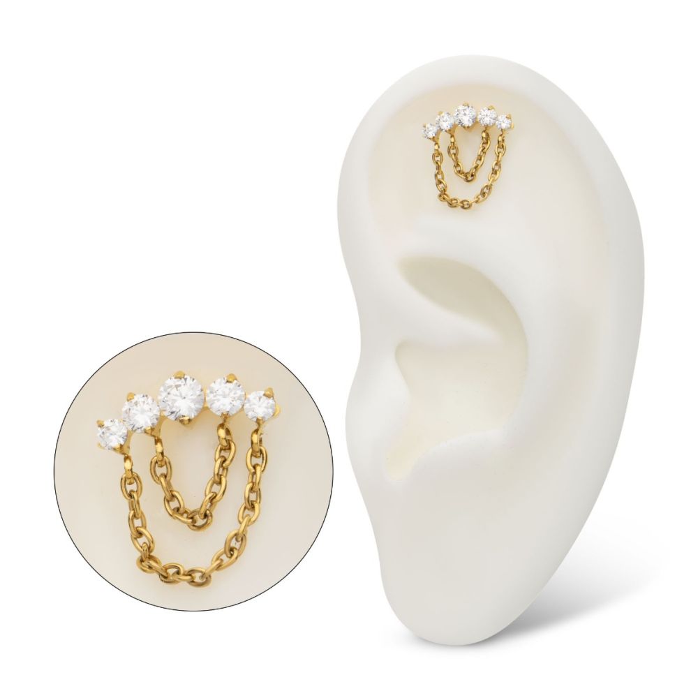 24Kt Gold PVD Titanium Threadless 5-Cluster Round AAA CZ Top with 2 Tier Dangle Chain. This Threadless Top is with 25g durable Titanium Pin designed to be practical and easy to use. Fitting all sizes of pins and bases in our threadless body jewelry line. Pin Size: 0.45mm x 4.7mm.