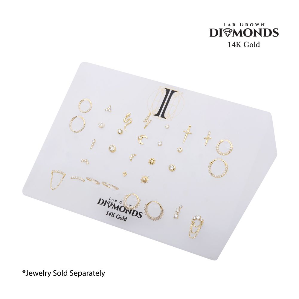 40 Hole Frosted Matte Finish Acrylic Landscape Display for 14Kt Gold Lab-Grown Diamonds. This display is made from Frosted Matte Finish Acrylic Display with pre-drilled holes for jewelry. This empty display accommodates 14Kt Gold Lab-Grown Diamond Tops and Hinged Segment Clickers. Jewelry is sold separately. Adapters are shipped with the display to accommodate different jewelry types.