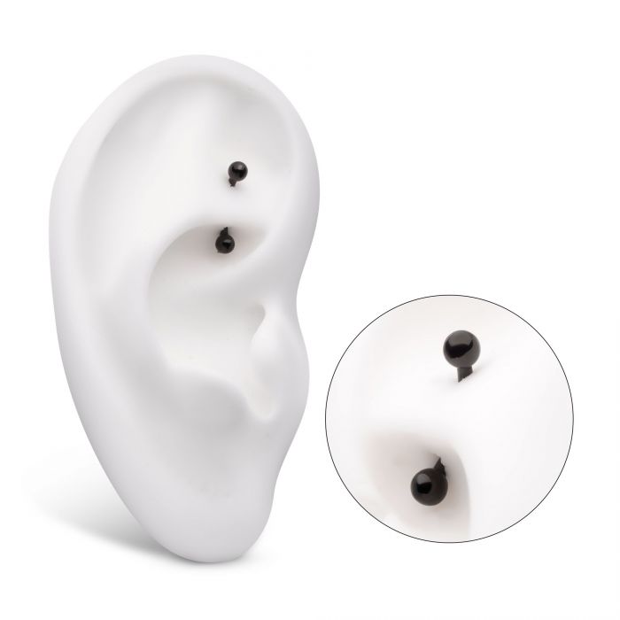 16g Black PVD Titanium Internally Threaded Ball End Curved Barbell. Available in 2 sizes. Manufactured from High Polish Implant Grade Titanium (Ti-6AL-4V-ELI ASTM F136).