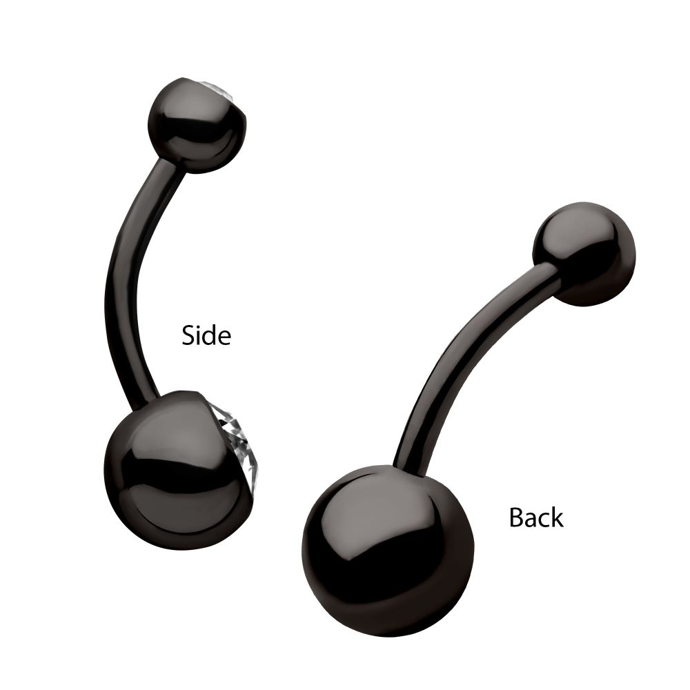 Black PVD Titanium Internally Threaded Bezel Set Double CZ Fixed Bottom Navel Ring. Manufactured from High Polish Implant Grade Titanium (Ti-6AL-4V-ELI ASTM F136).
