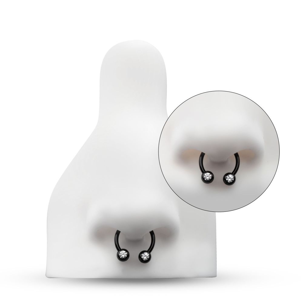 Black PVD Titanium Internally Threaded Forward Facing Bezel Set Round Gem Circular Barbell. Both ends are removable and thread off. Manufactured from High Polish Implant Grade Titanium (Ti-6AL-4V-ELI ASTM F136). Threading sizes fit 16g/M0.9.