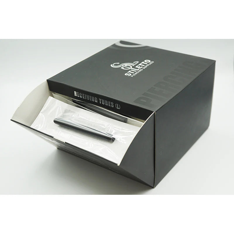 Our receiving tubes come in 2 sizes: Small (4 Gauge) and Large (0 Gauge) and in black and clear colors. Both sizes have a 30 degree cut in angle for precise piercing. The smaller tubes are perfect for almost any ear piercing while the large size can be used for noses and VCH’s.