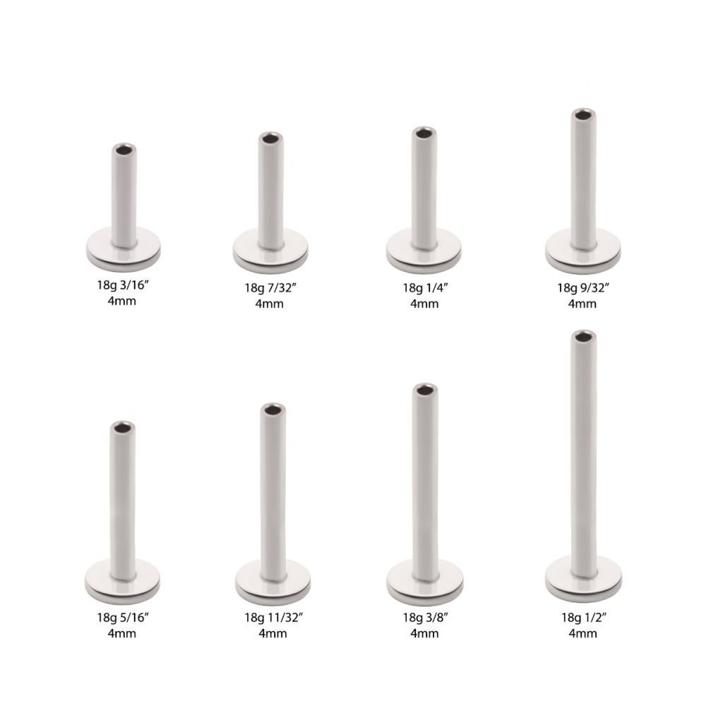 Titanium Threadless Labret with 4mm Flat base is manufactured from American High Polish Implant Grade Titanium (Ti-6AL-4V-ELI ASTM F136). Any threadless top in the line can be used in any of the Invictus threadless labrets. Pin Gauge: 25g. Material sourced in the USA.