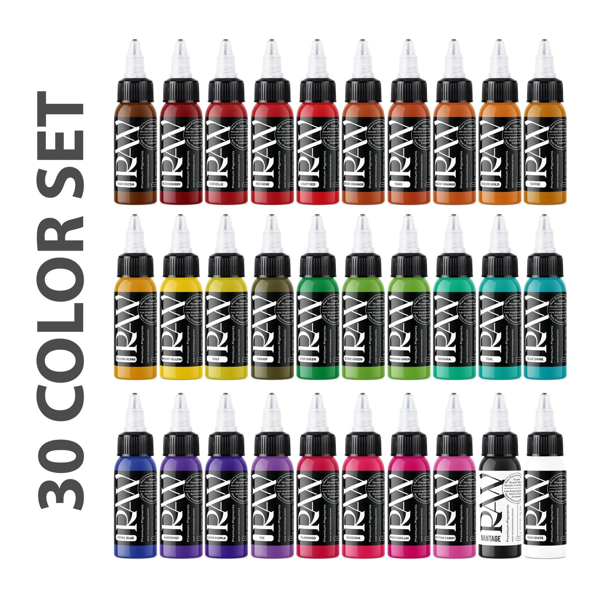 The RAW-30 Color Set delivers a comprehensive palette of 30 vibrant hues designed for professional Tattooing applications. This curated collection spans bold primaries like Bright Yellow and Royal Blue, rich jewel tones including Amethyst and Teal, warm metallics such as Liquid Gold and Yellow Ochre, and versatile neutrals from Raw White to Raw Cocoa. Each shade is formulated for consistent application and durability in professional settings. Whether you're executing intricate designs or building color portfolios, this expansive range ensures you have the precise color match for every piercing project. An essential toolkit for experienced artist seeking quality and variety in one complete set.