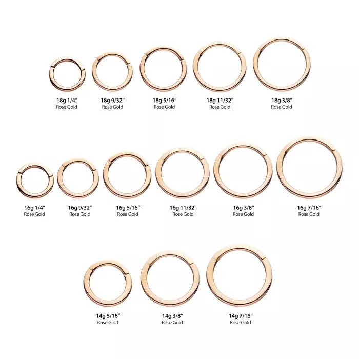 14Kt Rose Gold Basic Hinged Segment Clicker. The Hinged Segment Clicker offers an easy-to-use design with a minimal seam for an aesthetic that's similar to a segment ring without the stress of dealing with a segment that can get lost. The Hinged Segment Clicker is characterized by the hinged prong that snaps into place with a satisfying click. Perfect for Helix, Septum and Cartilage. Made of solid 14kt nickel-free Rose Gold.