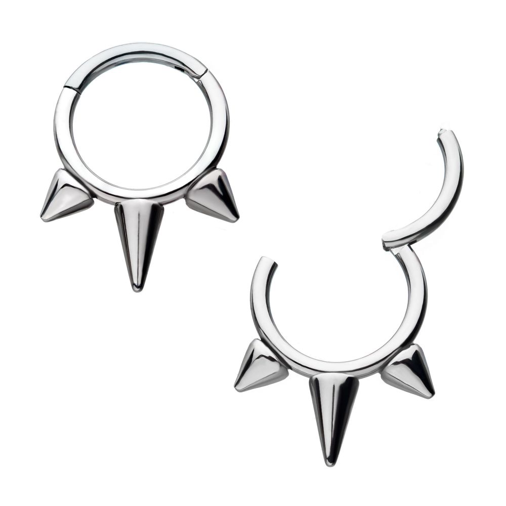 Three spikes adorn the bottom of this titanium hinged segment ring for a different look that will enhance any piercing it is placed in.