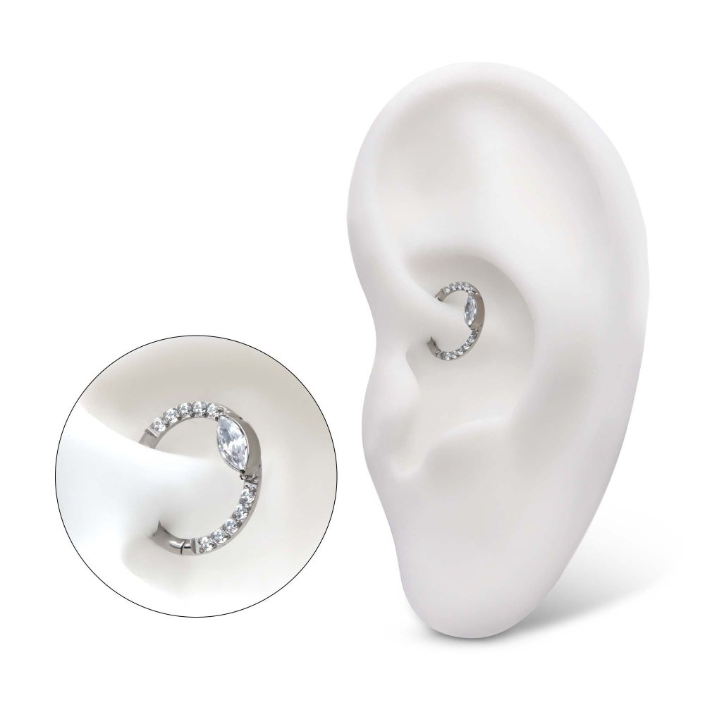 Titanium Eye CZ Front Facing Hinged Segment Clicker with CNC Set Round CZ. Manufactured from High Polish Implant Grade Titanium (Ti-6AL-4V-ELI ASTM F136).