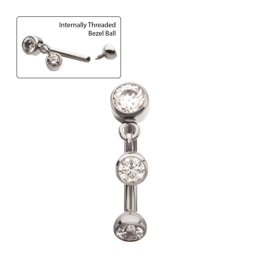 Titanium Internally Threaded Bezel Gem Fixed Top Curved Barbell with Floating Round CZ Dangle