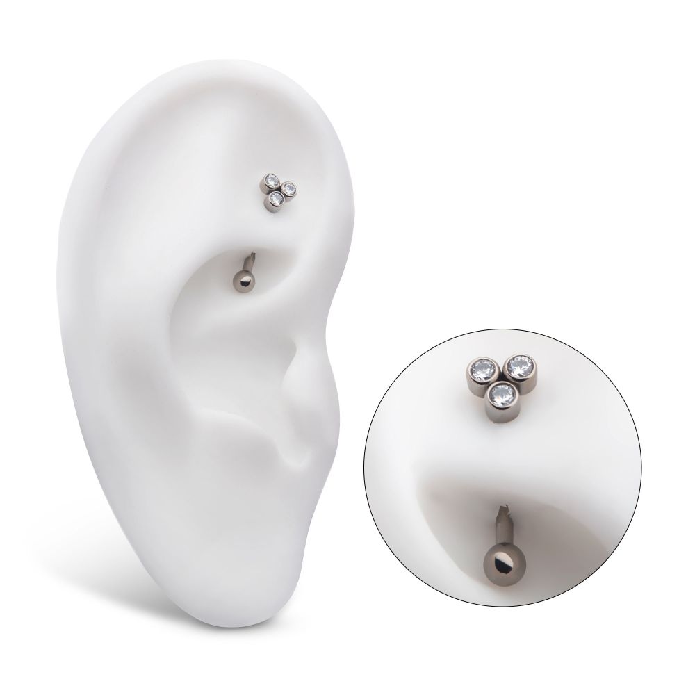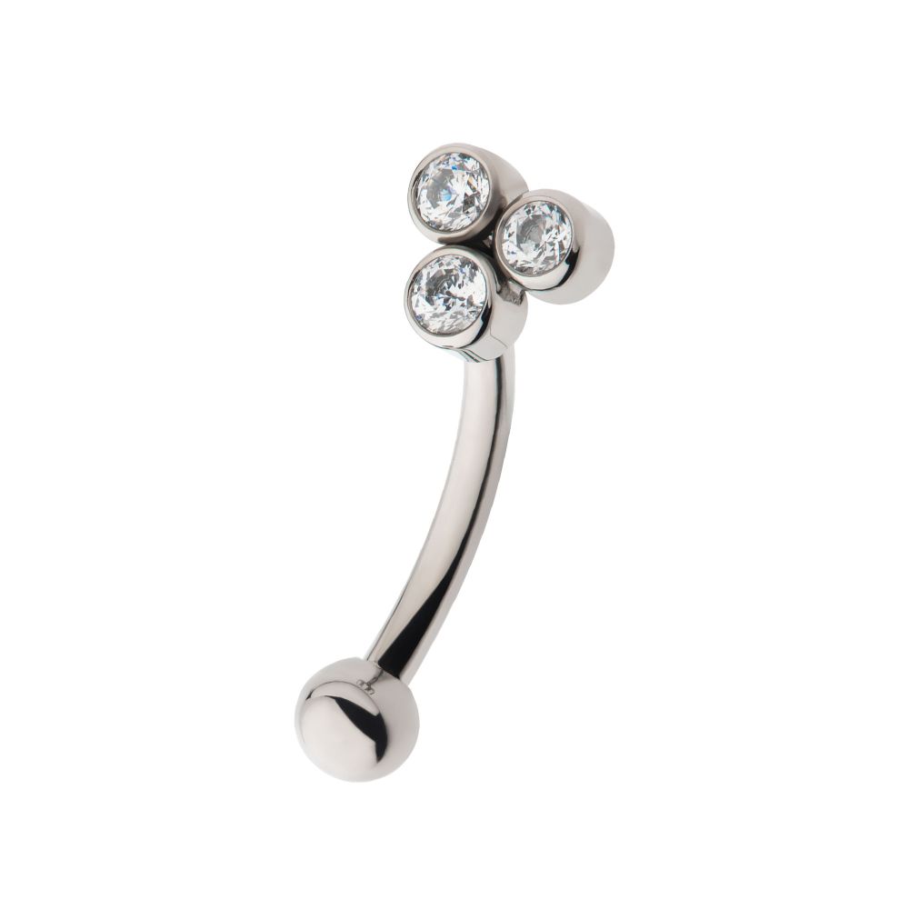 Titanium Internally Threaded Bezel Round CZ Trinity Fixed Top Curved Barbell. Manufactured from High Polish Implant Grade Titanium (Ti-6AL-4V-ELI ASTM F136).