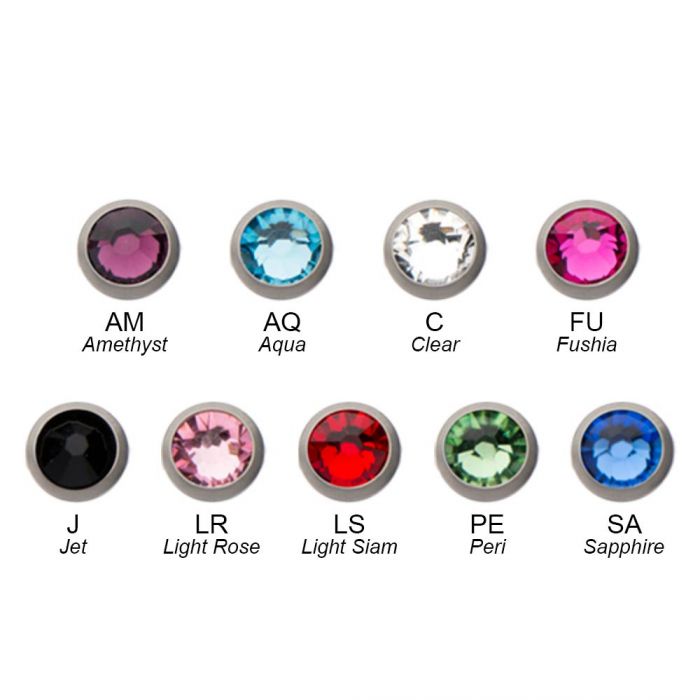 Titanium Jeweled Discs Threaded Ends With Bezel Set High-Quality Preciosa Crystals. 16g come in 2mm, 3mm & 4mm. 14g come in 3mm, 4mm & 5mm. No glue used to set gems. Fits M1.2/14G and M0.9/16G Internally Threaded Jewelry. Manufactured from High Polish Implant Grade Titanium (Ti-6AL-4V-ELI ASTM F136).
