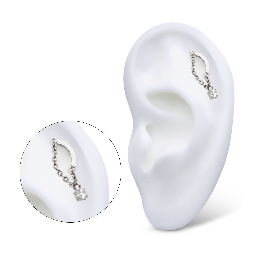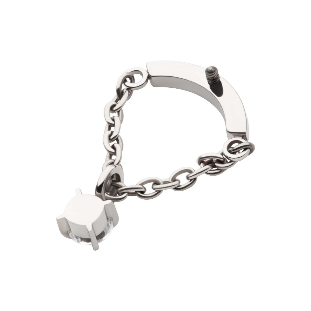 Titanium Internally Threaded Curved Bar Top with Dangle Chain & Prong Set Round AAA CZ. Manufactured from High Polish Implant Grade Titanium (Ti-6AL-4V-ELI ASTM F136).
