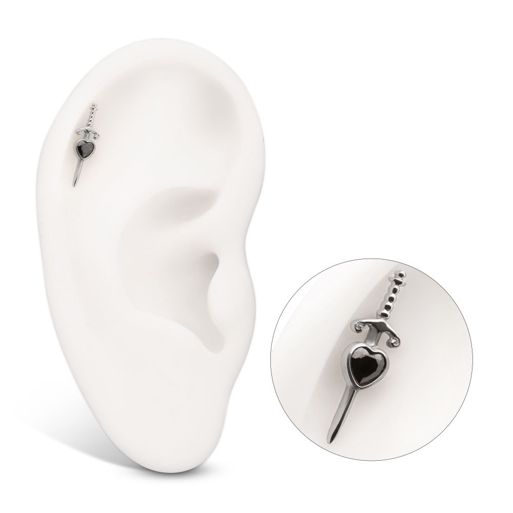 Titanium Internally Threaded Dagger with Bezel Set Black Heart Gem Top. Manufactured from High Polish Implant Grade Titanium (Ti-6AL-4V-ELI ASTM F136).