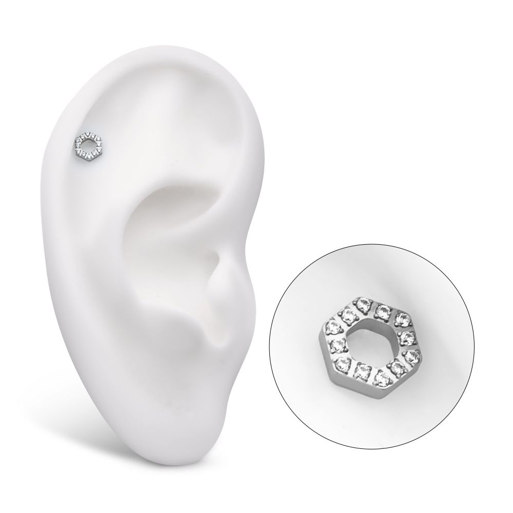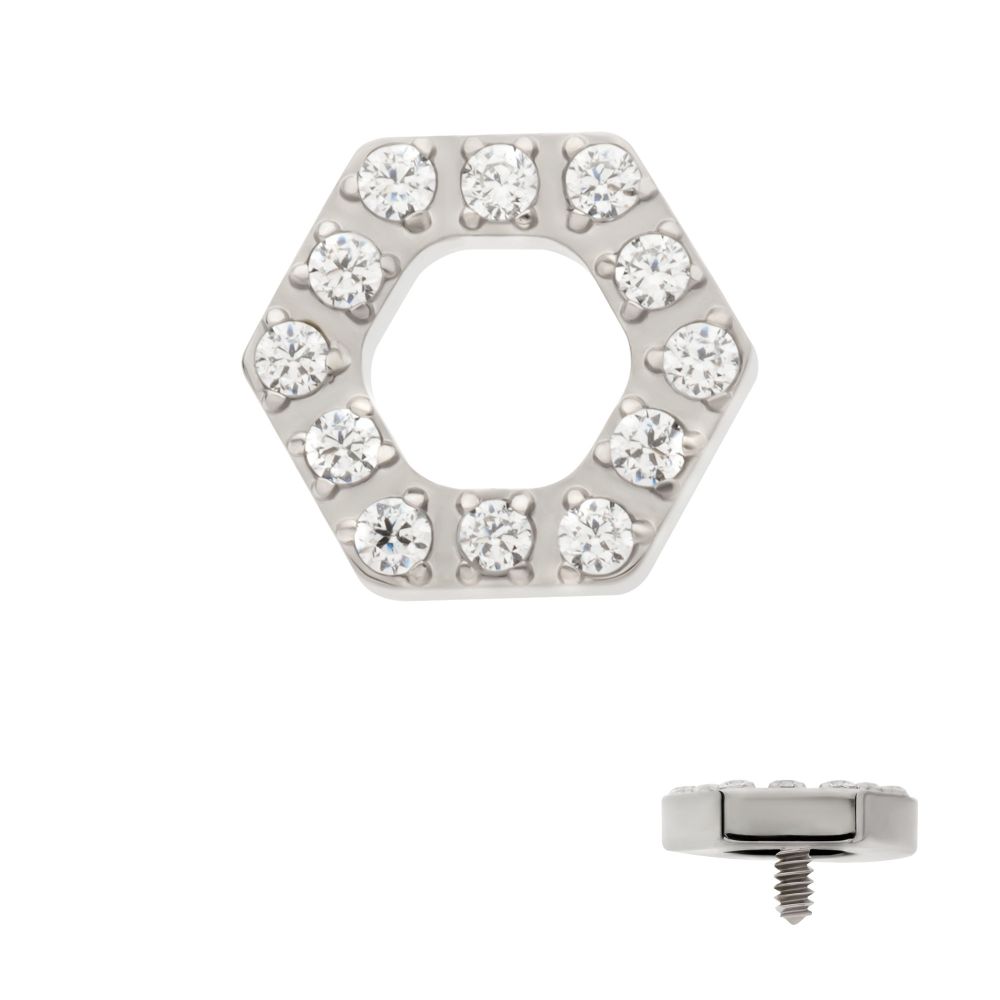 Titanium Internally Threaded Pave Set Round CZ Gem Hexagon Top. Manufactured from High Polish Implant Grade Titanium (Ti-6AL-4V-ELI ASTM F136).