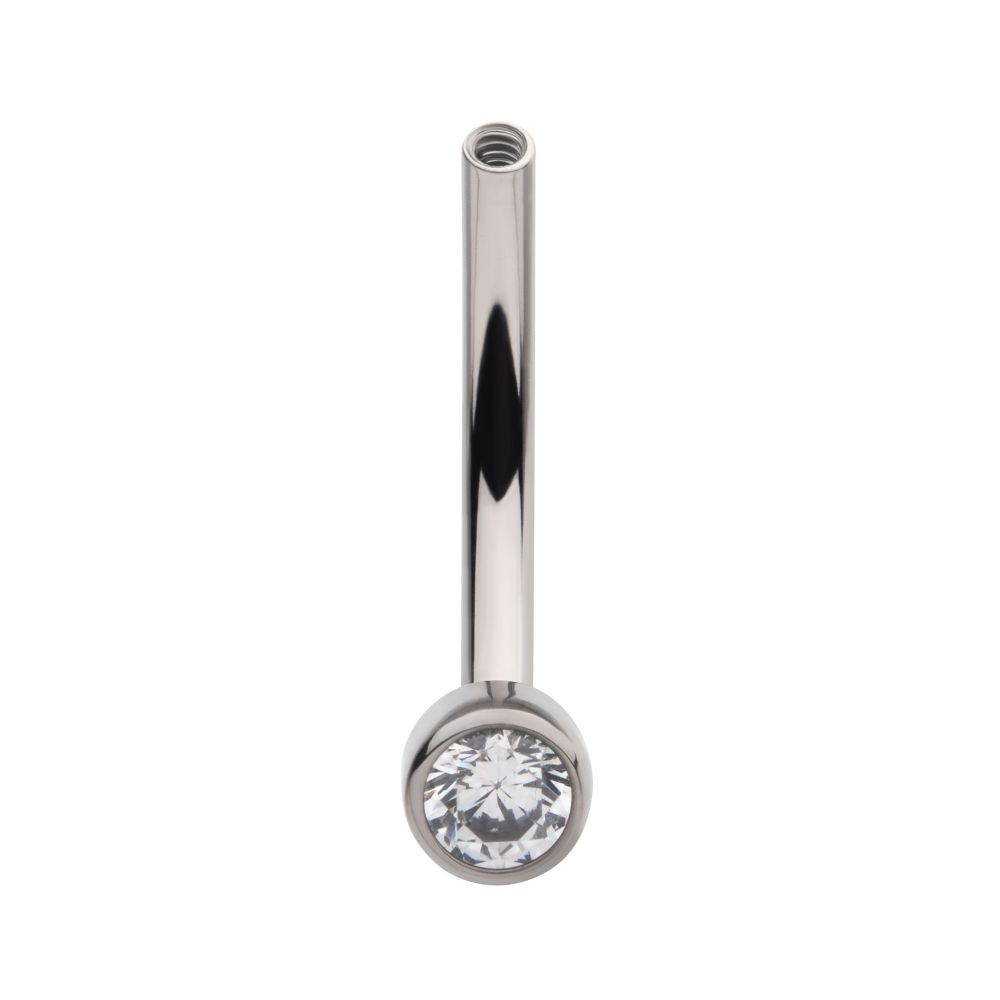 Titanium Internally Threaded with Bezel Set CZ Fixed Disc Curved Barbell without Top. 16G/M0.9 threading. Manufactured from High Polish Implant Grade Titanium (Ti-6AL-4V-ELI ASTM F136). Gem Size: 2.5mm.