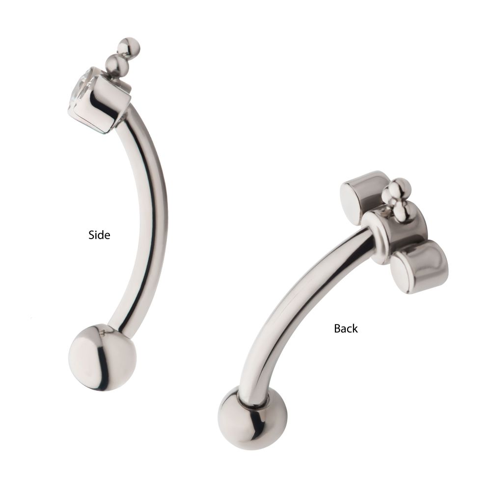 Titanium Internally Threaded with Tri Bead & 3-Cluster Bezel Set Clear AAA CZ Fixed Top Curved Barbell. Manufactured from High Polish Implant Grade Titanium (Ti-6AL-4V-ELI ASTM F136).
