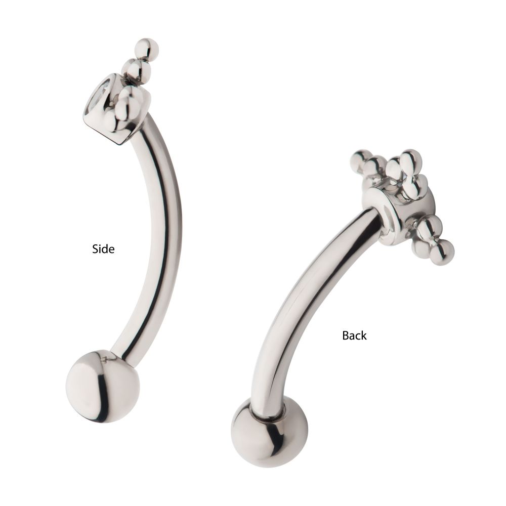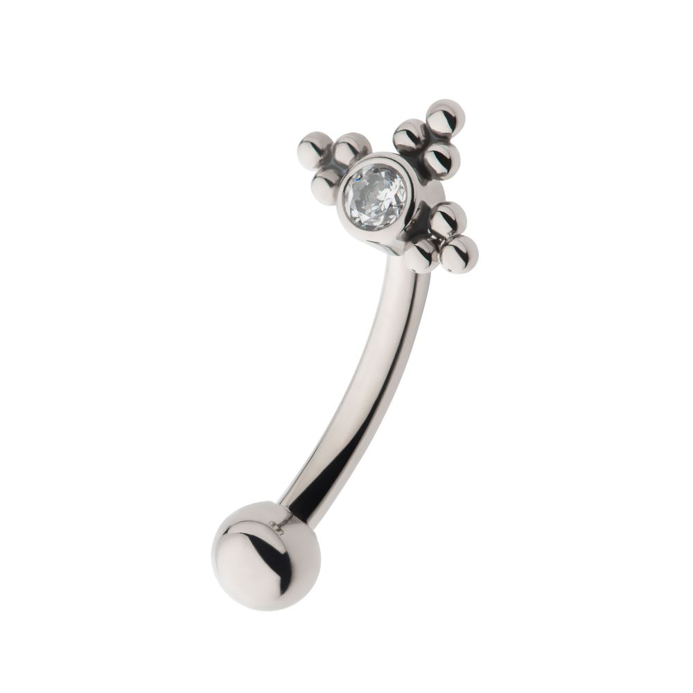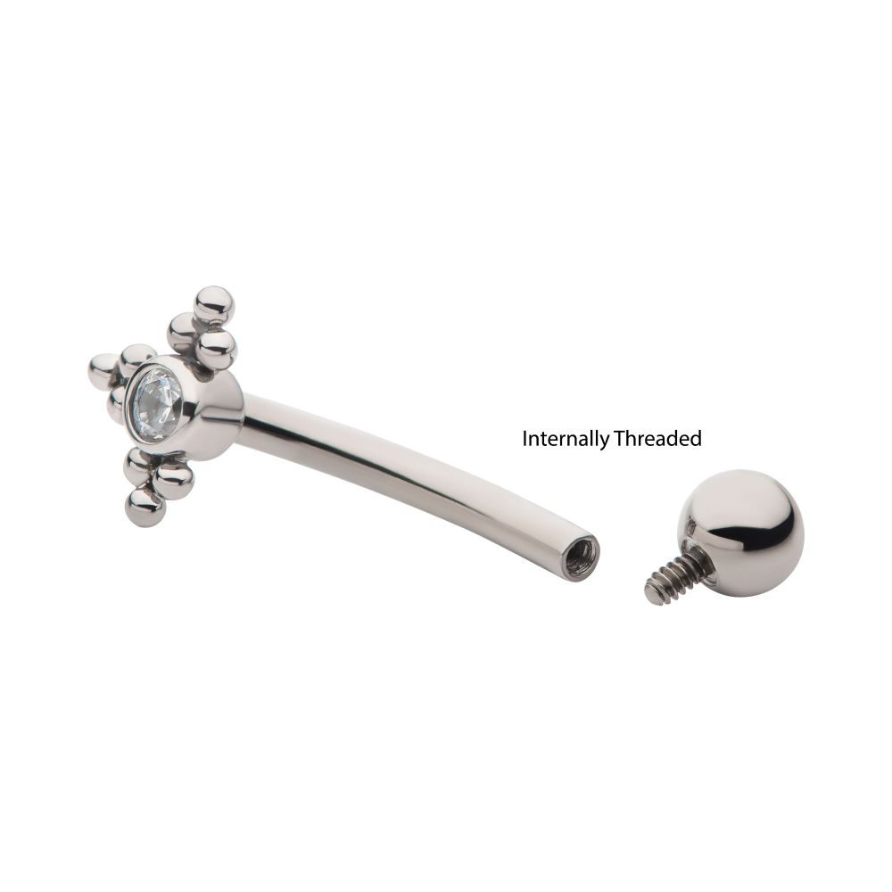Titanium Internally Threaded with Tri Beads Set & Bezel Set Clear AAA CZ Fixed Top Curved Barbell. Manufactured from High Polish Implant Grade Titanium (Ti-6AL-4V-ELI ASTM F136).