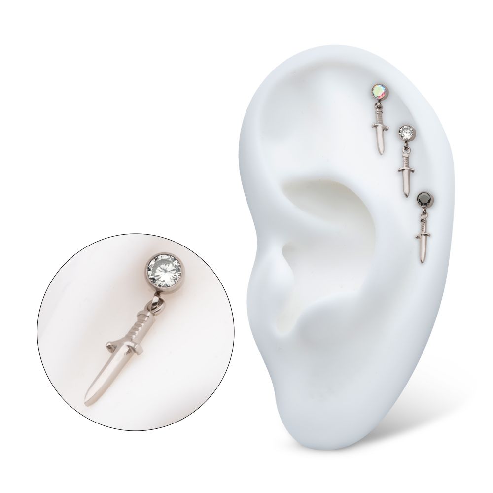 Titanium Threadless Bezel Round CZ Dangle Dagger Top. These Threadless Tops are made from Implant Grade Titanium TI-6AL-4V ELI ASTM F136 with 25g durable Titanium Pin designed to be practical and easy to use. Fitting all sizes of pins and bases in our threadless body jewelry line. Pin Size: 0.45mm x 4.7mm.