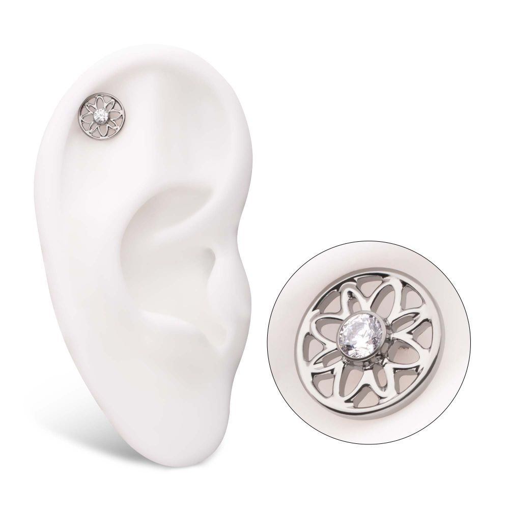 Titanium Threadless Bezel Set Gem Flower Mandala Top. This Threadless Top is made from Implant Grade Titanium TI-6AL-4V ELI ASTM F136 with 25g durable Titanium Pin designed to be practical and easy to use. Fitting all sizes of pins and bases in our threadless body jewelry line. Pin Size: 0.45mm x 4.7mm.