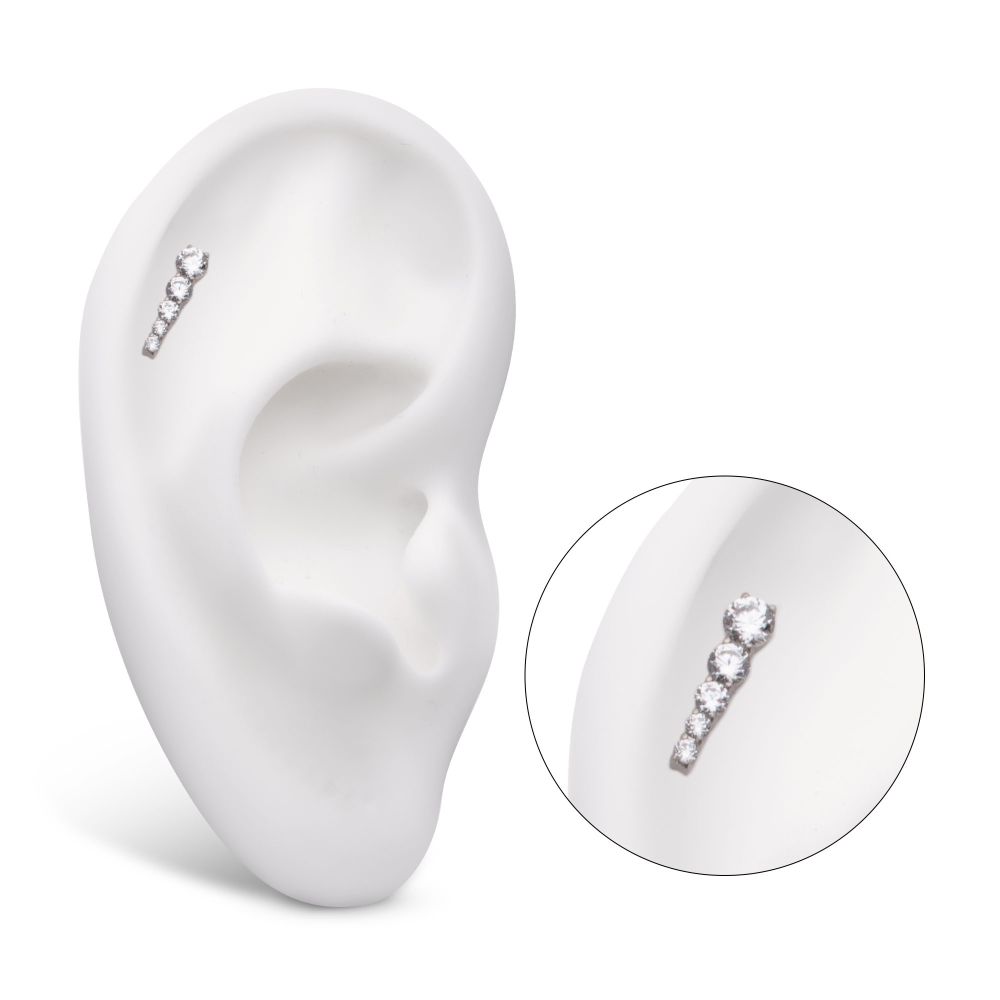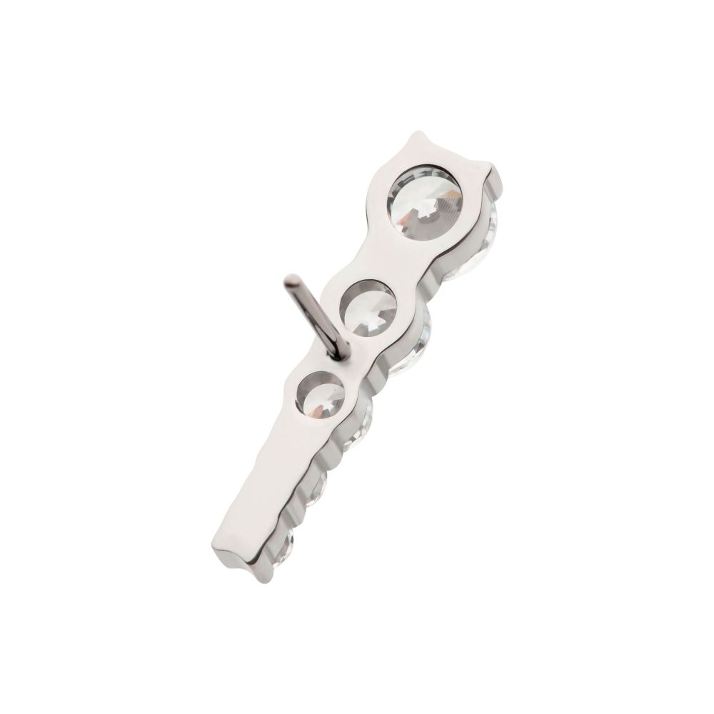 Titanium Threadless Cascading Prong Set Round CZ Gem 5-Cluster Top. This Threadless Top is made from Implant Grade Titanium TI-6AL-4V ELI ASTM F136 with 25g durable Titanium Pin designed to be practical and easy to use. Fitting all sizes of pins and bases in our threadless body jewelry line. Pin Size: 0.45mm x 4.7mm.