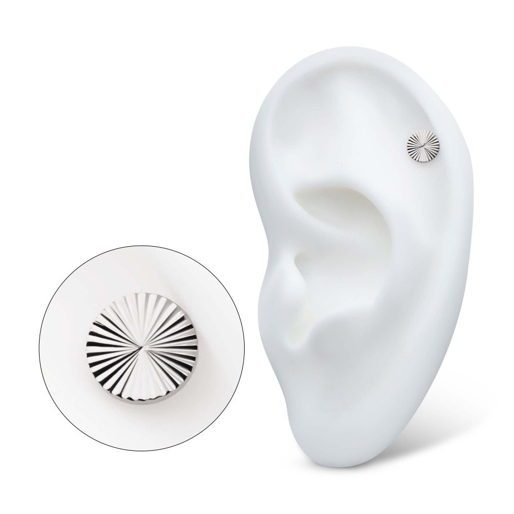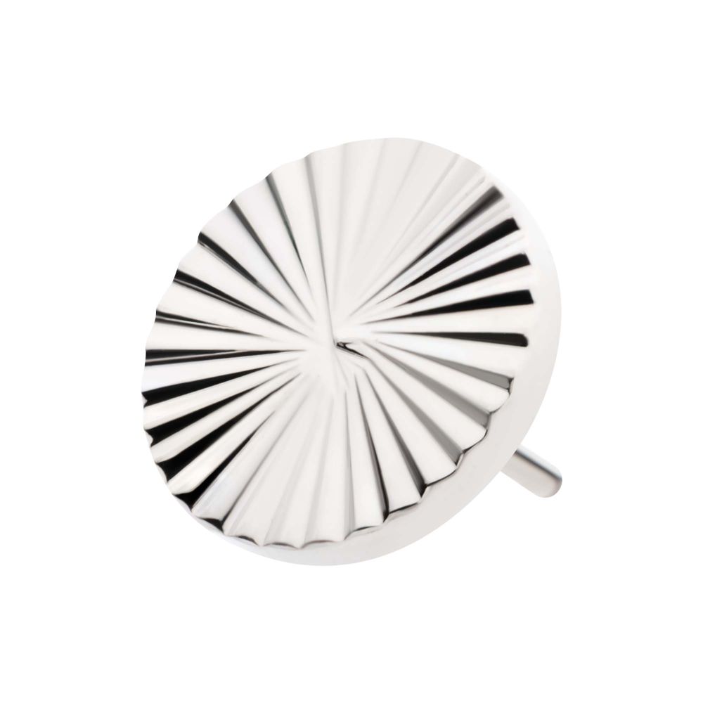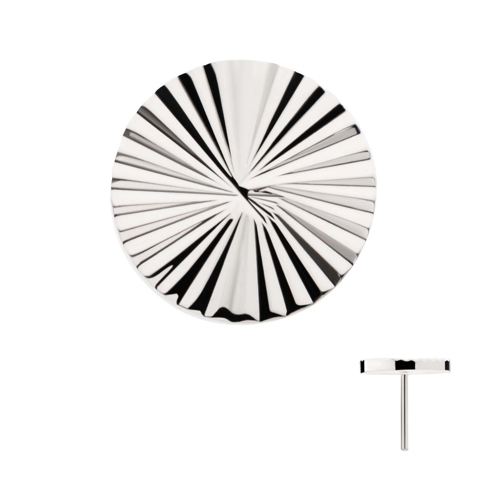 Titanium Threadless Corrugated Round Top. This Threadless Top is made from Implant Grade Titanium TI-6AL-4V ELI ASTM F136 with 25g durable Titanium Pin designed to be practical and easy to use. Fitting all sizes of pins and bases in our threadless body jewelry line. Pin Size: 0.45mm x 4.7mm.