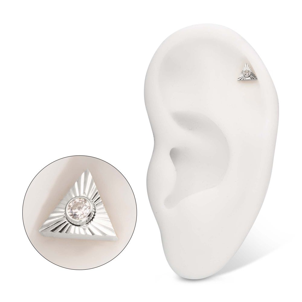Titanium Threadless Corrugated Triangle Top with Bezel Gem. Manufactured from High Polish Implant Grade Titanium (Ti-6AL-4V-ELI ASTM F136). Pin Size: 0.45mm x 4.7mm.