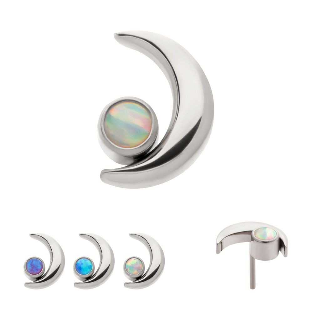 Titanium Threadless Crescent Moon with Bezel Set Opal Top. These Threadless Tops are made from Implant Grade Titanium TI-6AL-4V ELI ASTM F136 with 25g durable Titanium Pin designed to be practical and easy to use. Fitting all sizes of pins and bases in our threadless body jewelry line. Pin Size: 0.45mm x 4.7mm.