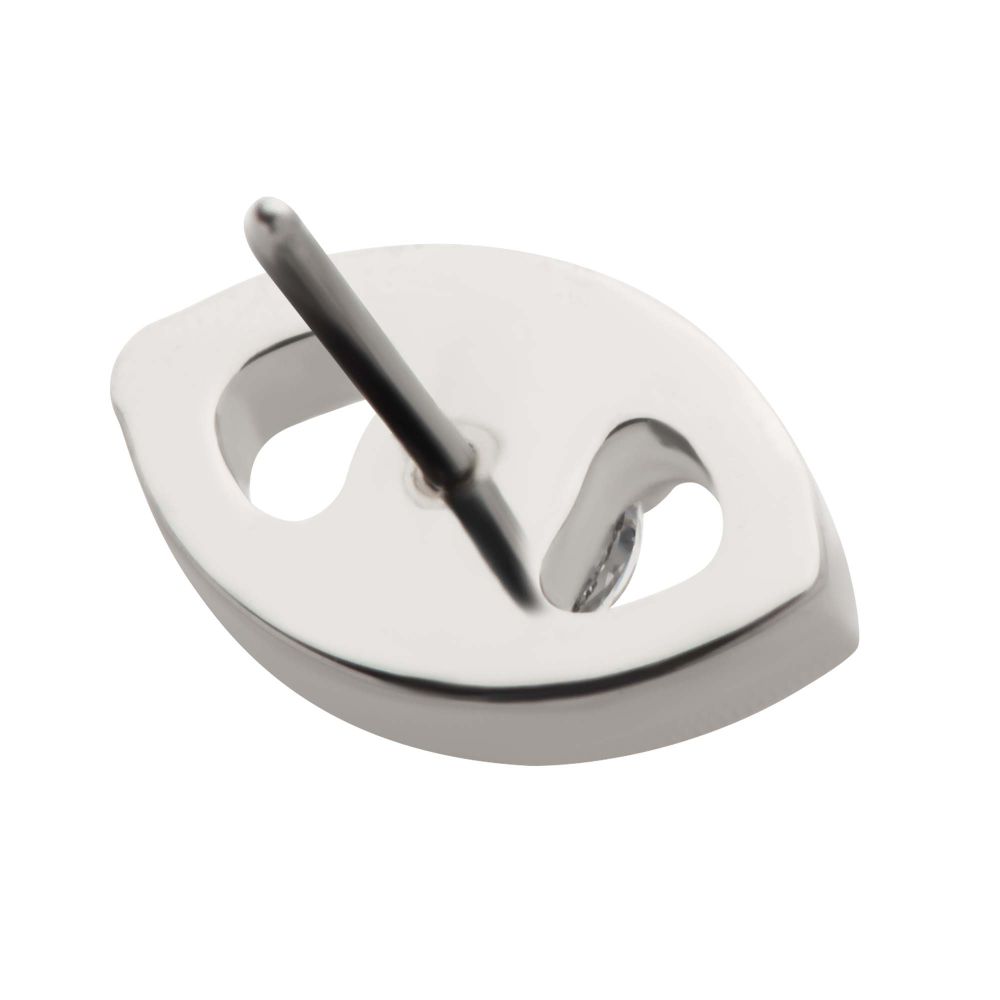 Titanium Threadless Cut Out Evil Eye Top with 4 Prong Clear CZ. This Threadless Top is made from Implant Grade Titanium TI-6AL-4V ELI ASTM F136 with 25g durable Titanium Pin designed to be practical and easy to use. Fitting all sizes of pins and bases in our threadless body jewelry line. Pin Size: 0.45mm x 4.7mm.