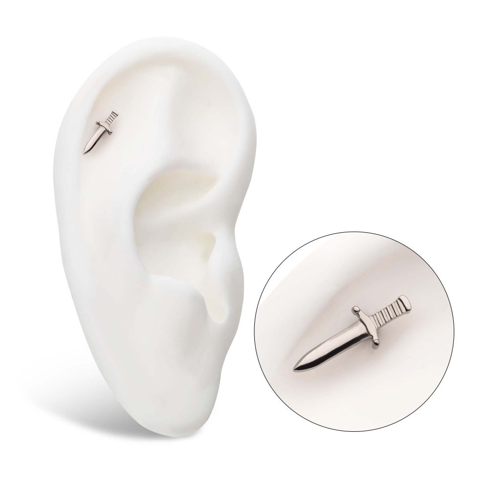 Titanium Threadless Dagger Top. This Threadless Top is made from Implant Grade Titanium TI-6AL-4V ELI ASTM F136 with 25g durable Titanium Pin designed to be practical and easy to use. Fitting all sizes of pins and bases in our threadless body jewelry line. Pin Size: 0.45mm x 4.7mm.