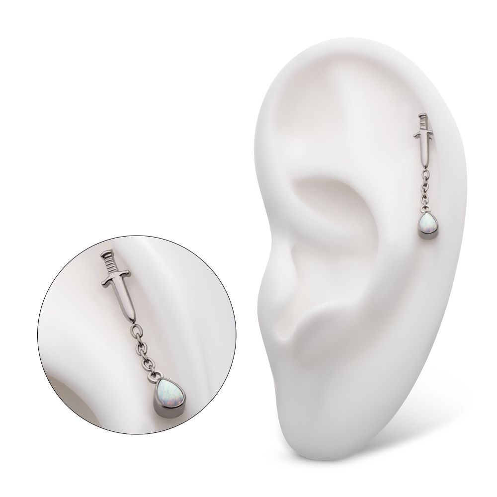 Titanium Threadless Dagger Top with Bezel Set Teardrop Opal Chain Dangle. This Threadless Top is made from Implant Grade Titanium TI-6AL-4V ELI ASTM F136 with 25g durable Titanium Pin designed to be practical and easy to use. Fitting all sizes of pins and bases in our threadless body jewelry line. Pin Size: 0.45mm x 4.7mm.
