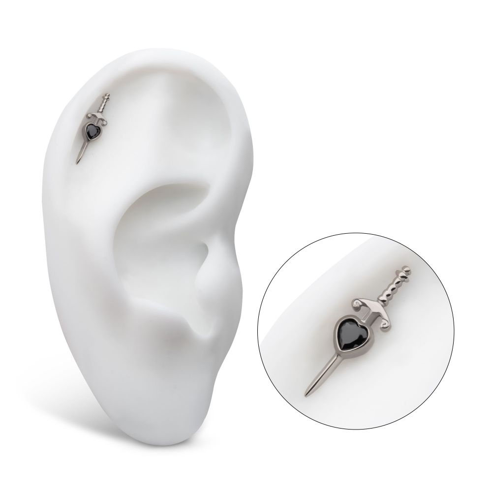 Titanium Threadless Dagger with Bezel Set Black Heart Gem Top. This Threadless Top is made from Implant Grade Titanium TI-6AL-4V ELI ASTM F136 with 25g durable Titanium Pin designed to be practical and easy to use. Fitting all sizes of pins and bases in our threadless body jewelry line. Pin Size: 0.45mm x 4.7mm.