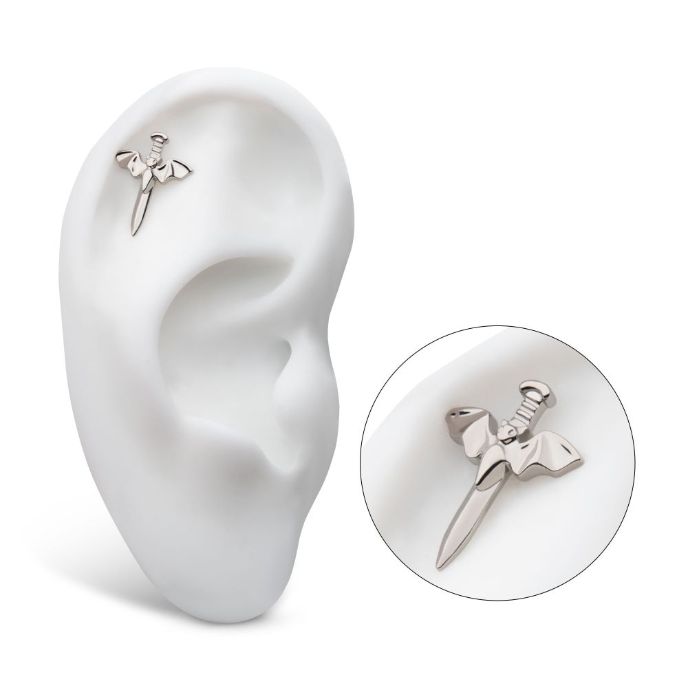 Titanium Threadless Dagger with Flying Bat Top. This Threadless Top is made from Implant Grade Titanium TI-6AL-4V ELI ASTM F136 with 25g durable Titanium Pin designed to be practical and easy to use. Fitting all sizes of pins and bases in our threadless body jewelry line. Pin Size: 0.45mm x 4.7mm.
