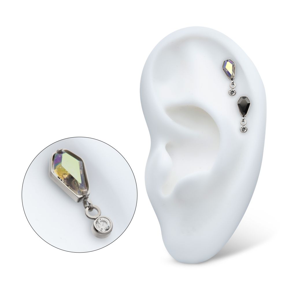 Titanium Threadless Dangle Bezel Round & Coffin CZ Top. These Threadless Tops are made from Implant Grade Titanium TI-6AL-4V ELI ASTM F136 with 25g durable Titanium Pin designed to be practical and easy to use. Fitting all sizes of pins and bases in our threadless body jewelry line. Pin Size: 0.45mm x 4.7mm.