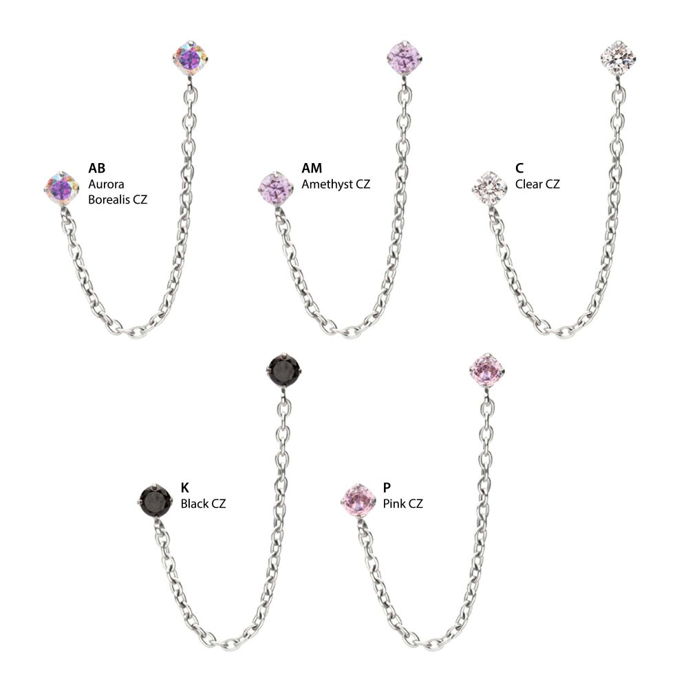 Titanium Threadless Double Prong Set Gem Top with Rolo Chain Dangle. This Threadless Top is made from Implant Grade Titanium TI-6AL-4V ELI ASTM F136 with 25g durable Titanium Pin designed to be practical and easy to use. Fitting all sizes of pins and bases in our threadless body jewelry line. Pin Size: 0.45mm x 4.7mm.