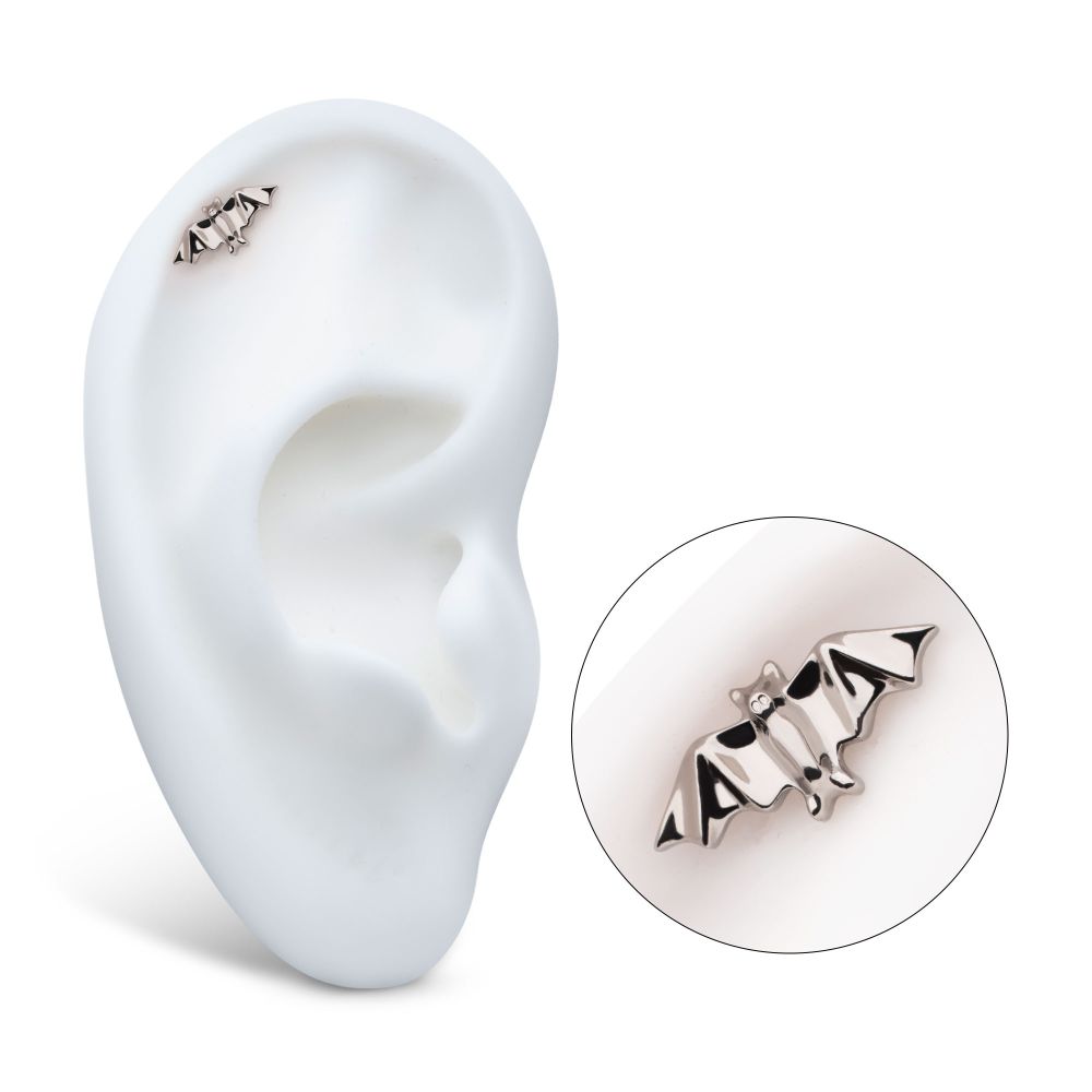 Titanium Threadless Flying Bat Top. This Threadless Top is made from Implant Grade Titanium TI-6AL-4V ELI ASTM F136 with 25g durable Titanium Pin designed to be practical and easy to use. Fitting all sizes of pins and bases in our threadless body jewelry line. Pin Size: 0.45mm x 4.7mm.