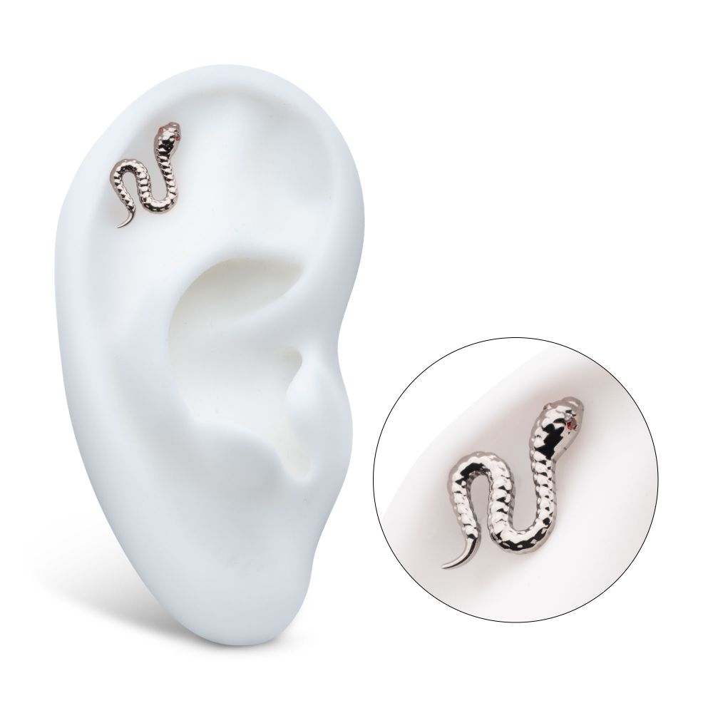 Titanium Threadless Garnet CZ Eye Snake Top. This Threadless Top is made from Implant Grade Titanium TI-6AL-4V ELI ASTM F136 with 25g durable Titanium Pin designed to be practical and easy to use. Fitting all sizes of pins and bases in our threadless body jewelry line. Pin Size: 0.45mm x 4.7mm.