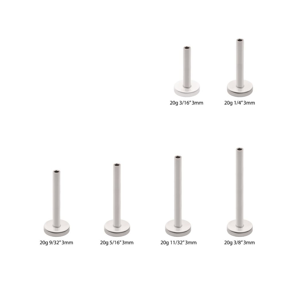 Titanium Threadless Labret 3mm Flat base with manufactured from American High Polish Implant Grade Titanium (Ti-6AL-4V-ELI ASTM F136). Any threadless top in the line can be used in any of the Invictus threadless labrets. Pin Gauge: 25g. Material sourced in the USA.