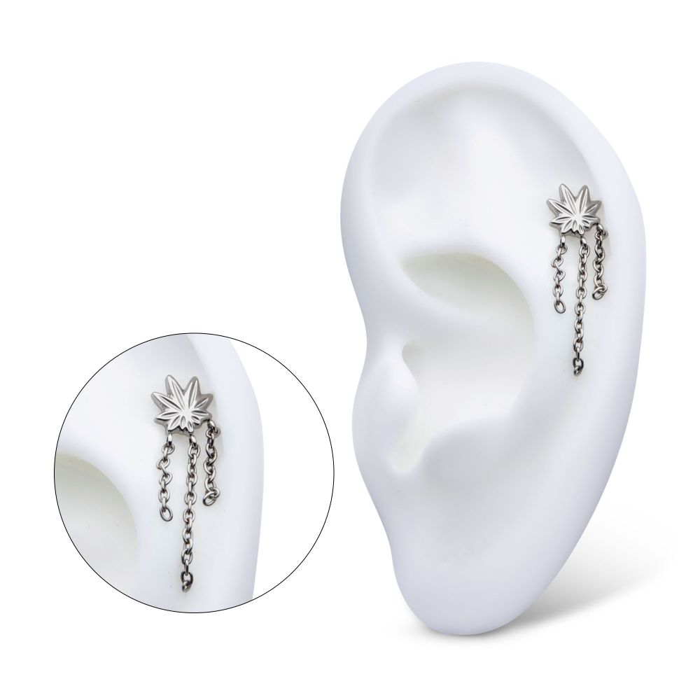 Titanium Threadless Pot Leaf Top with 3 Dangle Chains. This Threadless Top is made from Implant Grade Titanium TI-6AL-4V ELI ASTM F136 with 25g durable Titanium Pin designed to be practical and easy to use. Fitting all sizes of pins and bases in our threadless body jewelry line. Pin Size: 0.45mm x 4.7mm.
