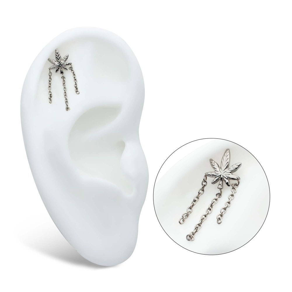 Titanium Threadless Pot Leaf Top with Triple Dangle Chain. Manufactured from High Polish Implant Grade Titanium (Ti-6AL-4V-ELI ASTM F136). Pin Size: 0.45mm x 4.7mm.
